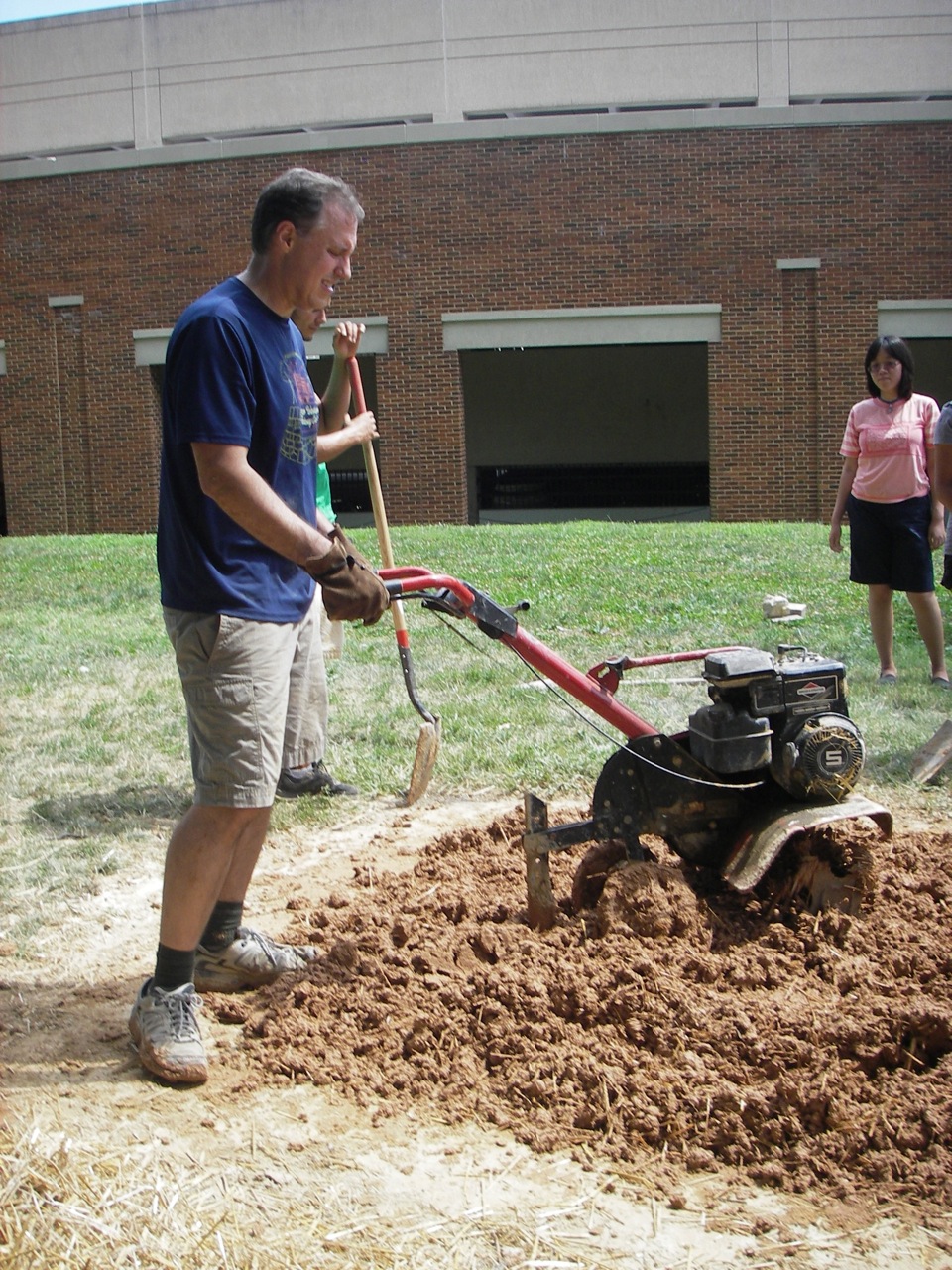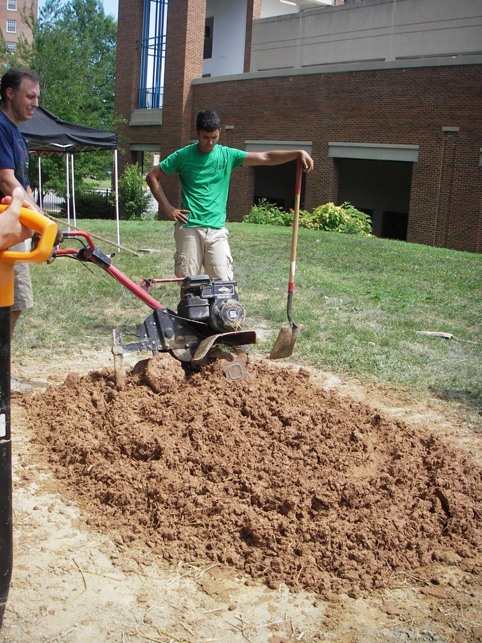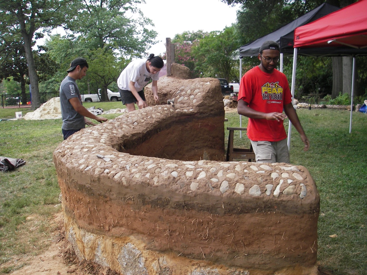 Finally, the garden manager at the university gave us a batch of nearly black clay with lots of topsoil in it. This process of getting clay from multiple sites and the lack of storage space forced us to stop work many times while pickup trucks roamed the Maryland University campus looking for someone to provide us with dirt. Also, we did not have the space to stockpile materials because we had only a small bit of paved surface available to us, and in this space we had to park our cars, store sod and gravely dirt removed from our wall footprint, store our sand, tools and other materials, and do our mixing. This gave us only enough space to tiller mix one batch of clay, sand and straw at a time, and no space to stockpile the differently colored clays as they would have blocked our parking spaces. As a result of this our structure became less than half of what we originally planned, but we still mixed and moved around 20,000 pounds of cob with a crew that varied from 4 to 6 working adults and a few one-day volunteers and children.