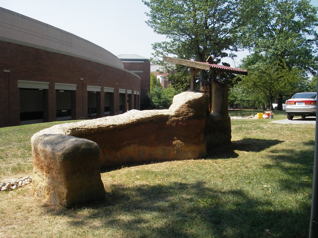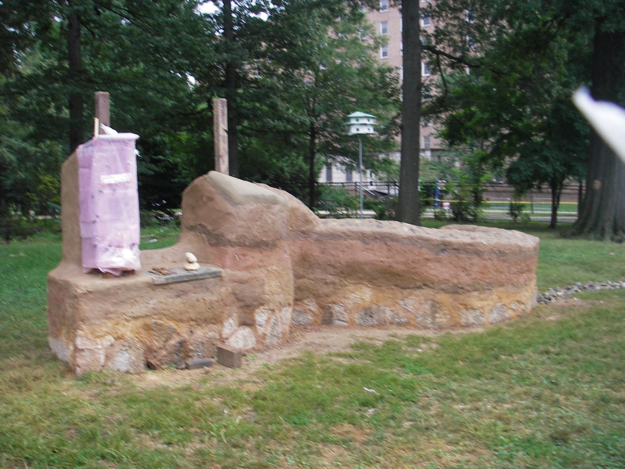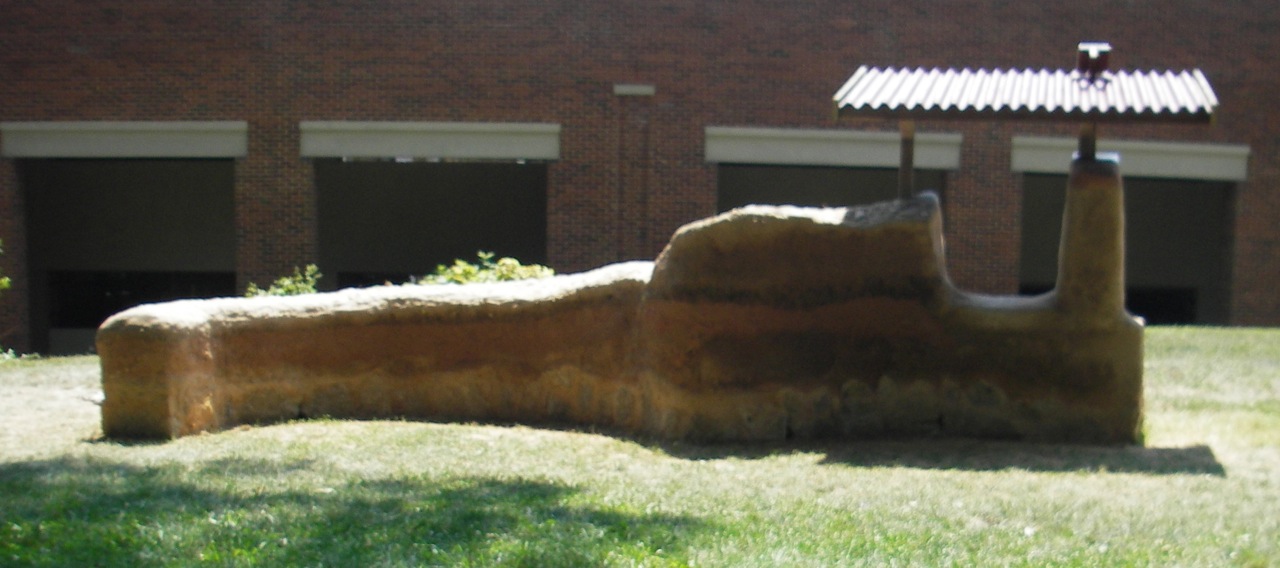 Finally, the garden manager at the university gave us a batch of nearly black clay with lots of topsoil in it. This process of getting clay from multiple sites and the lack of storage space forced us to stop work many times while pickup trucks roamed the Maryland University campus looking for someone to provide us with dirt. Also, we did not have the space to stockpile materials because we had only a small bit of paved surface available to us, and in this space we had to park our cars, store sod and gravely dirt removed from our wall footprint, store our sand, tools and other materials, and do our mixing. This gave us only enough space to tiller mix one batch of clay, sand and straw at a time, and no space to stockpile the differently colored clays as they would have blocked our parking spaces. As a result of this our structure became less than half of what we originally planned, but we still mixed and moved around 20,000 pounds of cob with a crew that varied from 4 to 6 working adults and a few one-day volunteers and children.