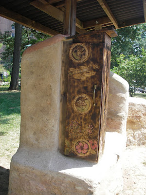 When some of our pieces of urbanite started to tilt out because of splooging pressure on the inner surface, we used the ugly stick to pound them back into vertical. We also used it to break up lumps of dry hard-packed clay in order to make a special plaster used for cob mixtures. At some points in the wall you can see streaks of bright red clay. This color came from lumps of red clay that we separated out from ordinary reddish brown clay and shattered on the pavement with the ugly stick. We hydrated the lumps in a bucket of water using a half inch drill and a drywall mud mixer paddle.