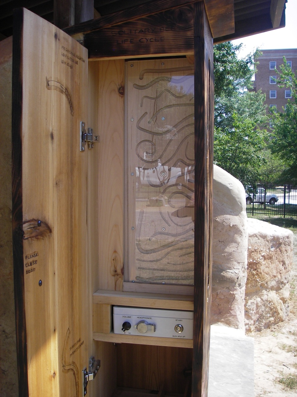 Fig. 13 Bee box with opened door showing audio amplifier and passageways for several species of solitary bee. Note differently sized passageways for large and small species of bees.