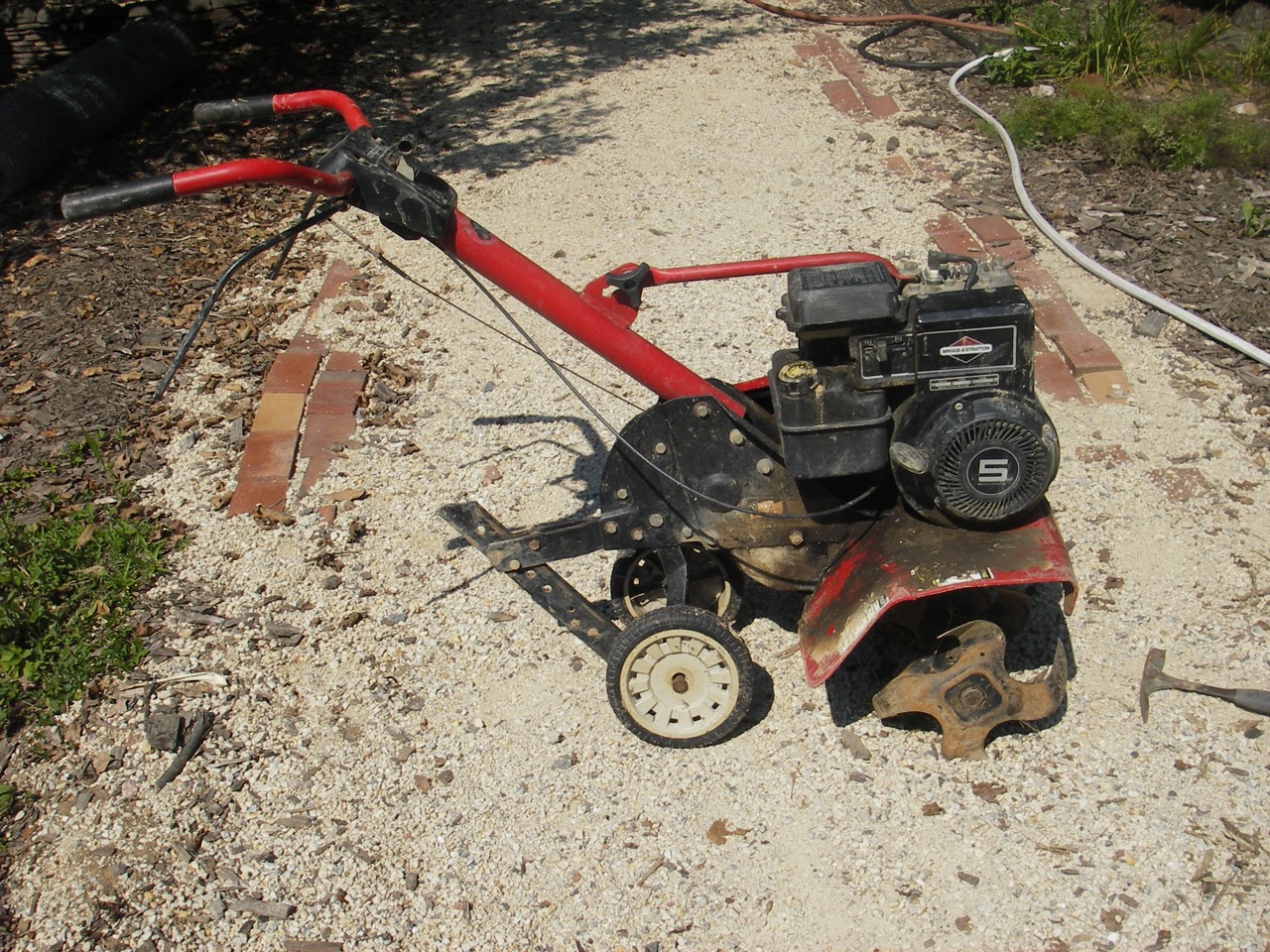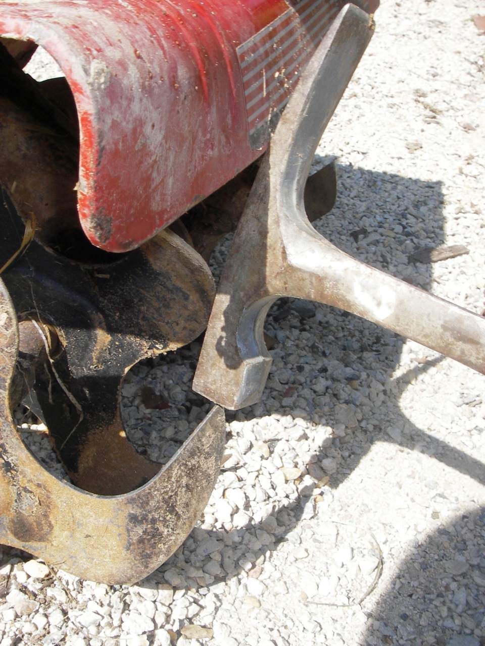 I use a mason’s hammer to clean chunks of clay and straw off of the tines. Also, I should note that this is a very old tiller, and working on cement or asphalt pavement sharpens the tines to a razor point. Before I stick my hands in between the tines to remove clumps of clay and straw I give each tine a sharp rap with the blunt end of the hammer to blunt the tines and avoid inadvertently cutting my hands or arms.