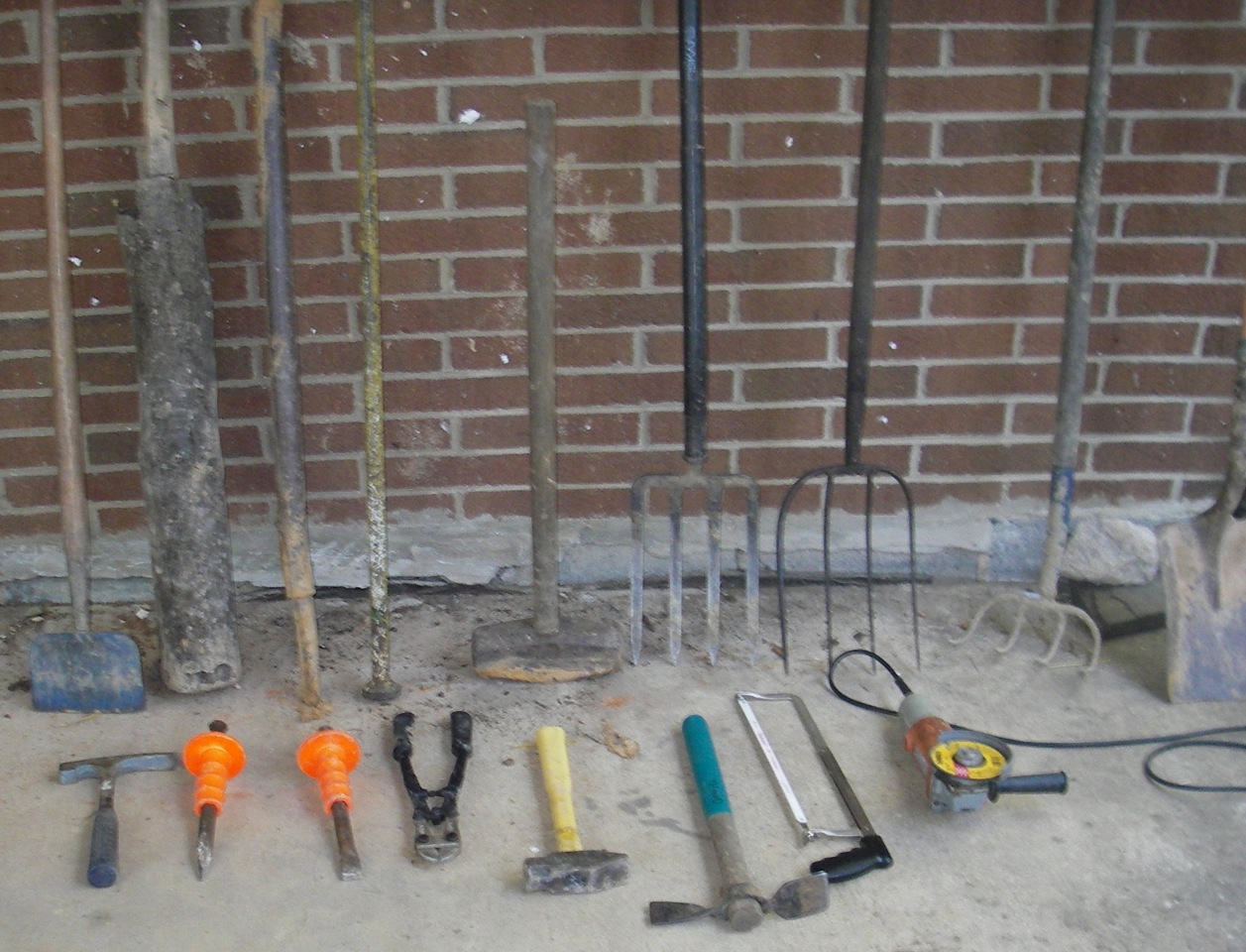 In the front row there is a mason’s hammer, point chisel, 1” chisel, wire cutters, 3-pound hammer, Ground Hog, hacksaw and grinder.