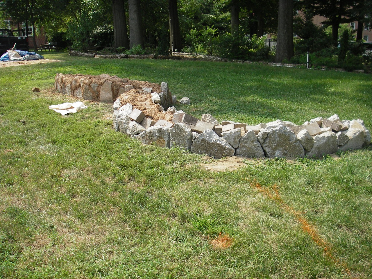 The concrete of the urbanite had been poured onto a bluestone base, giving us a finished side and a gravely side. After some discussion we decided to place the gravely side facing out. The center of the wall is also urbanite standing on edge, with small chunks bridging spaces between larger chunks to produce a base that is honeycombed with passageways for drainage, and for snakes, toads, crickets and other things that like to live in such places. We also placed a section of drainage pipe in there but just ran it into a shallow French drain.
